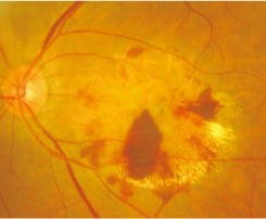 ・滲出型加齢黄斑変性:黄斑部に発生した新生血管が原因で、視力の低下やもののゆがみ(変視症)が生じる病気です。